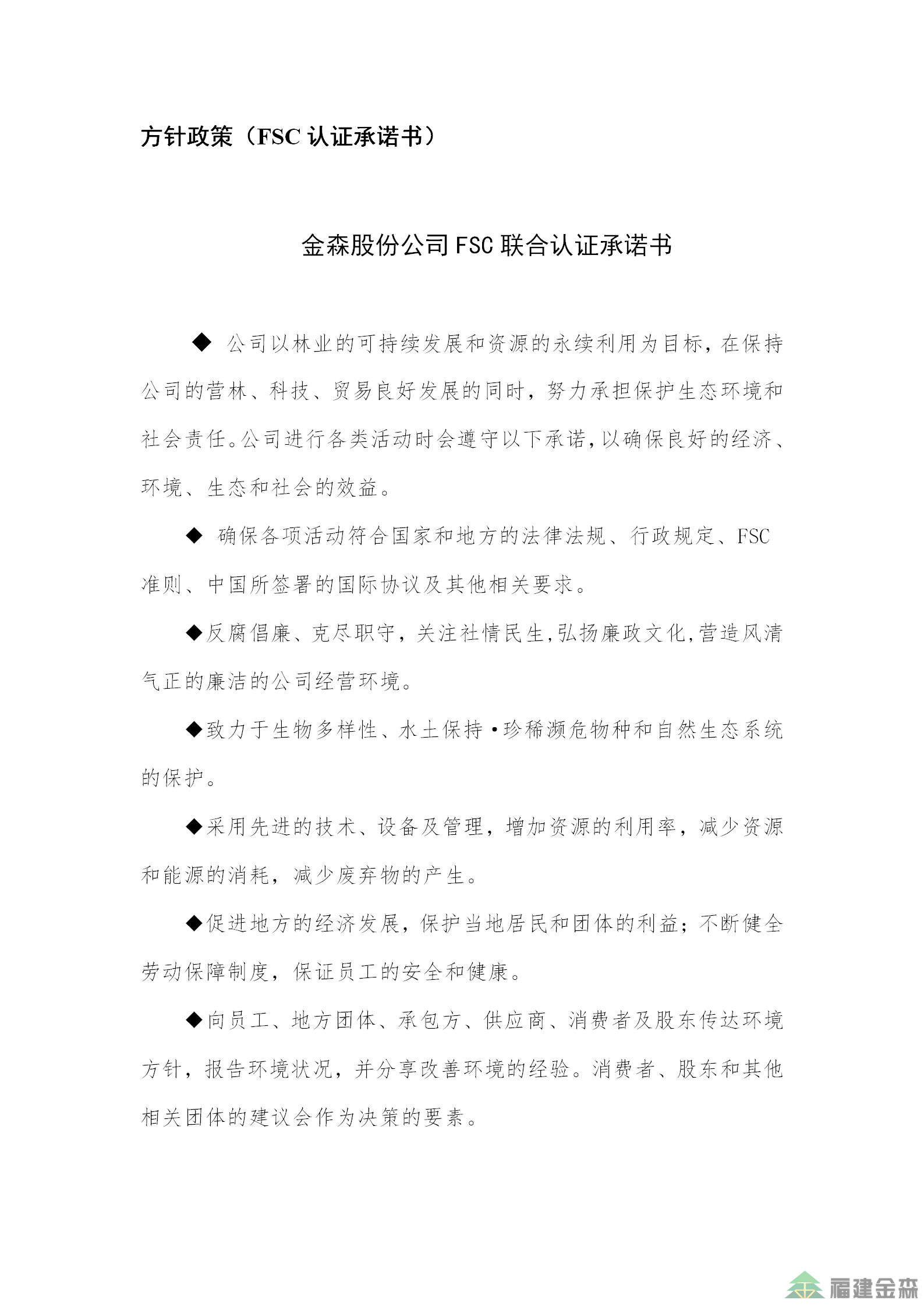 福建金森林業(yè)股份有限公司FSC聯(lián)合認(rèn)證承諾書(shū)