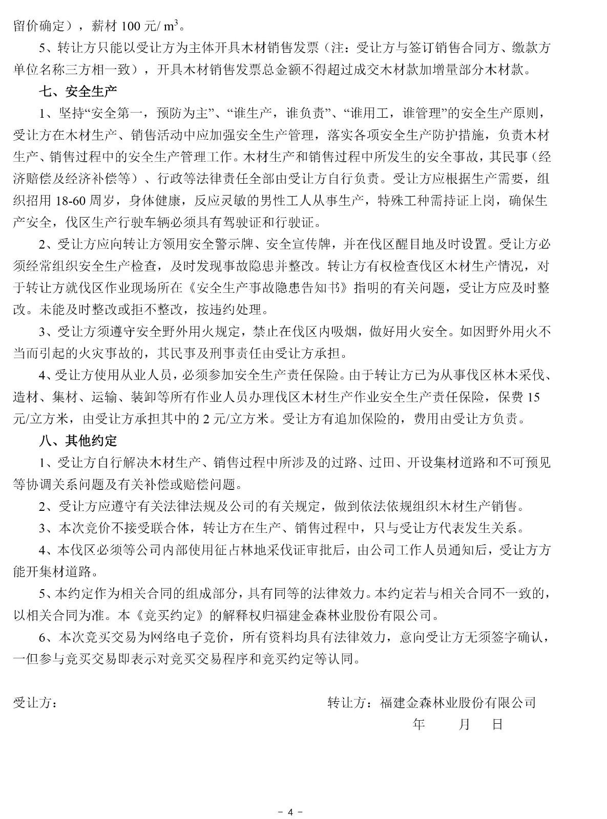 成交確認、價款支付及合同簽訂 | 1 .成交后的兩個工作日內(nèi)受讓方以微信、郵箱等方式收到《成交通知書》掃描件或電話通知;若受讓方未及時收到成交通知書的,請主動與轉(zhuǎn)讓方聯(lián)系。 2.價款交納日期及方式:成交后,受讓方須于2022年2月16日17:00前將首期木材款(詳見木材資源情況一覽表)及每標生產(chǎn)風險保證金6.5萬元(含木材生產(chǎn)進度、質(zhì)量保證金3萬元;銷售進度保證金1.5萬元;安全生產(chǎn)保證金2萬元)轉(zhuǎn)入轉(zhuǎn)讓方指定銀行賬戶,并與轉(zhuǎn)讓方簽訂《木材生產(chǎn)承攬合同》和《木材購銷合同》。尾款交付方式以木材資源情況一覽表為準。 轉(zhuǎn)讓方指定銀行賬戶如下: 戶名:福建金森林業(yè)股份有限公司 開戶銀行:福建將樂成功村鎮(zhèn)銀行股份有限公司 賬號:9031510010010000033058 3.受讓方不依據(jù)本公告的要求履約的,視為自動放棄受讓資格,其已交納的交易保證金不予退回,并對交易中心因此造成的損失承擔賠償責任,轉(zhuǎn)讓方有權(quán)將該標的重新組織競買交易。 | ||