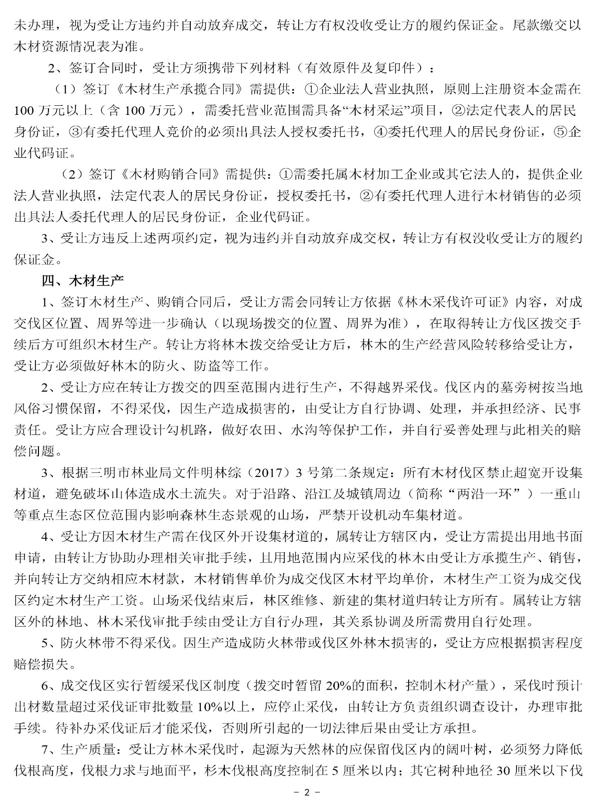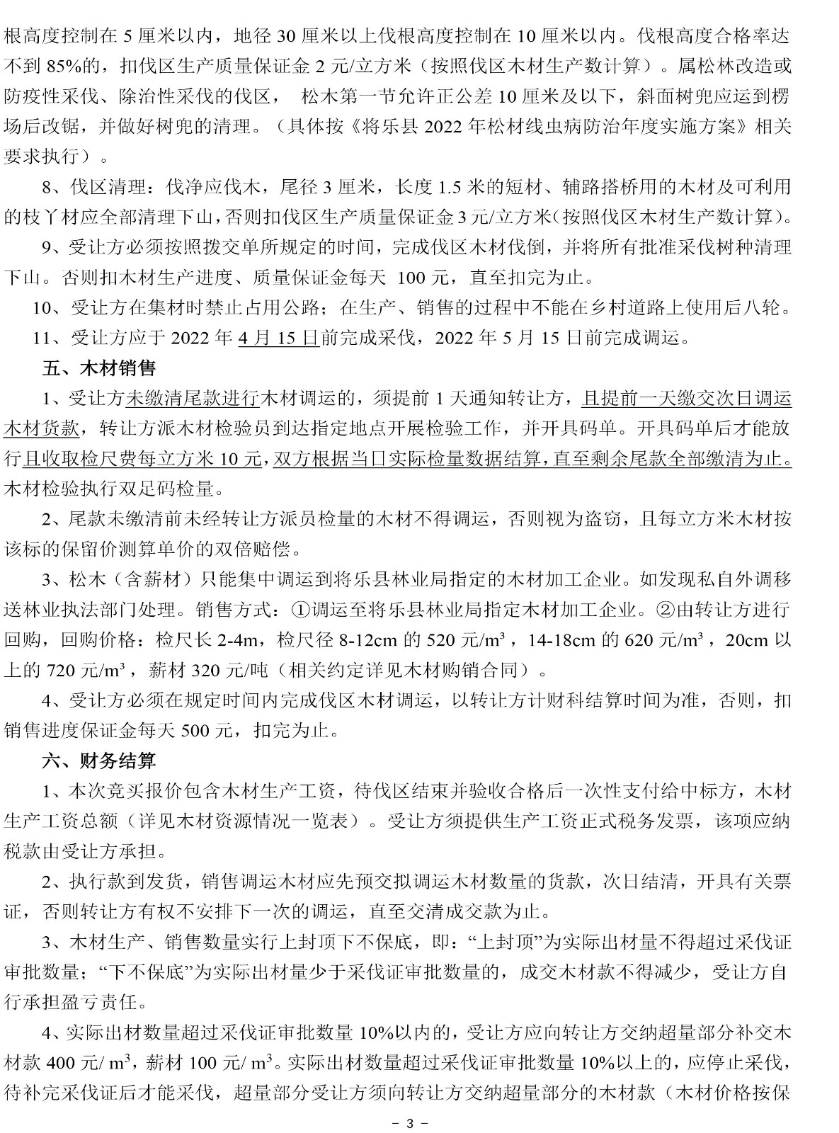 重要信息披露 | 1、標的簡介所列的出材量等數(shù)據(jù)僅供參考,標的以現(xiàn)狀交付,轉(zhuǎn)讓方及交易中心不承擔標的面積與實測面積、標的出材量與實際出材量差異等責任,不調(diào)整相應的成交價格。 2、本次競買報價包含木材生產(chǎn)工資,木材生產(chǎn)工資總額詳見木材資源情況一覽表,待伐區(qū)結(jié)束并驗收后一次性支付給受讓方。 3、銷售費用、成交后發(fā)生的政策變化費用、稅收均由受讓方承擔。 4、松木(含薪材)只能集中調(diào)運到將樂縣林業(yè)局指定的木材加工企業(yè)。如發(fā)現(xiàn)私自外調(diào)的,將移送林業(yè)執(zhí)法部門處理。銷售方式:①調(diào)運至將樂縣林業(yè)局指定木材加工企業(yè)。②由轉(zhuǎn)讓方進行回購(相關(guān)約定詳見木材購銷合同)。 5、受讓方應于2022年4月15日前完成采伐,2022年5月15日前完成調(diào)運。 6、未盡事宜詳見木材資源情況一覽表、競買約定、木材生產(chǎn)承包合同(范本)、木材購銷合同(范本)、伐區(qū)位置示意圖等本公告其他附件。 | ||