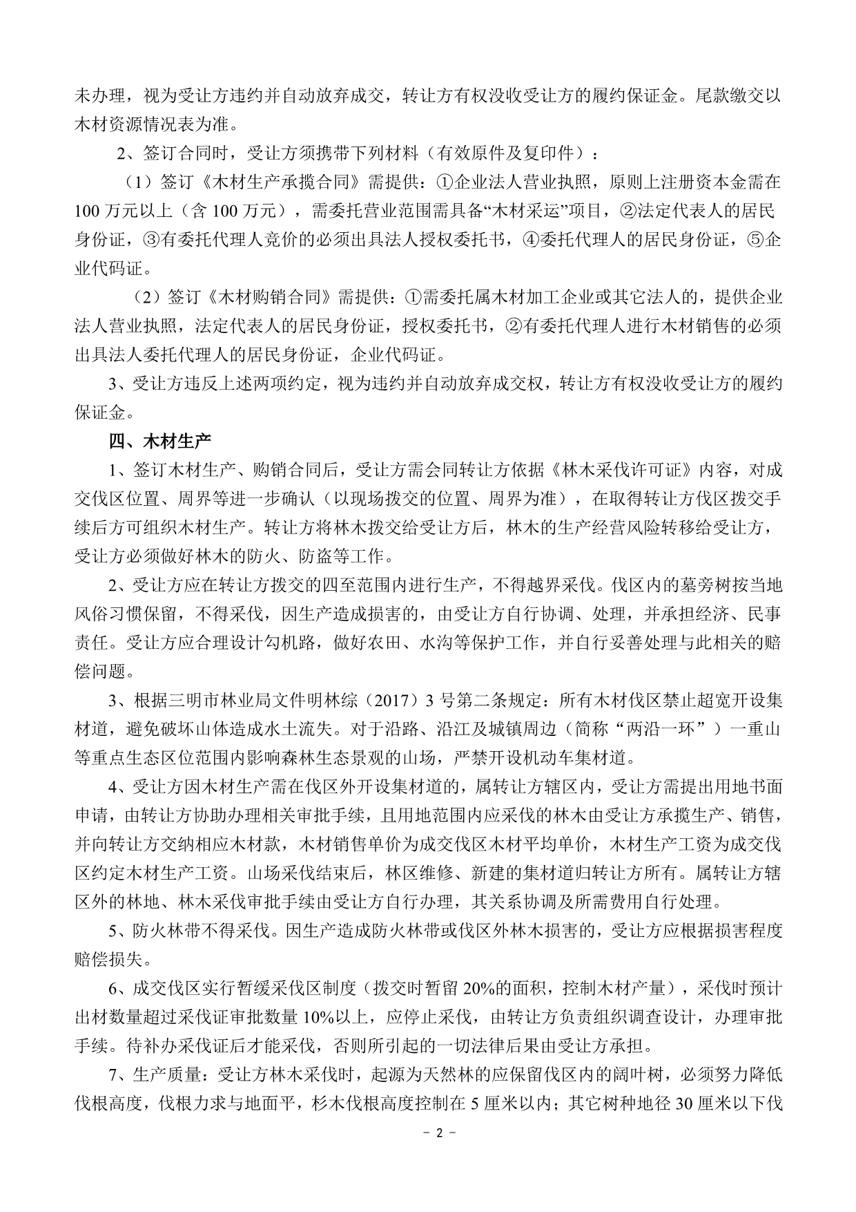 重要信息披露 | 1、標(biāo)的簡(jiǎn)介所列的出材量等數(shù)據(jù)僅供參考,標(biāo)的以現(xiàn)狀交付,轉(zhuǎn)讓方及交易中心不承擔(dān)標(biāo)的面積與實(shí)測(cè)面積、標(biāo)的出材量與實(shí)際出材量差異等責(zé)任,不調(diào)整相應(yīng)的成交價(jià)格。 2、本次競(jìng)買報(bào)價(jià)包含木材生產(chǎn)工資,木材生產(chǎn)工資總額詳見(jiàn)木材資源情況一覽表,待伐區(qū)結(jié)束并驗(yàn)收后一次性支付給受讓方。 3、銷售費(fèi)用、成交后發(fā)生的政策變化費(fèi)用、稅收均由受讓方承擔(dān)。 4、松木(含薪材)只能集中調(diào)運(yùn)到將樂(lè)縣林業(yè)局指定的木材加工企業(yè)。如發(fā)現(xiàn)私自外調(diào)的,將移送林業(yè)執(zhí)法部門處理。銷售方式:①調(diào)運(yùn)至將樂(lè)縣林業(yè)局指定木材加工企業(yè)。②由轉(zhuǎn)讓方指定單位進(jìn)行收購(gòu)(第3.5.6標(biāo)中有松木改造伐區(qū),上述標(biāo)的的松木必須由轉(zhuǎn)讓方指定單位進(jìn)行收購(gòu))(相關(guān)約定詳見(jiàn)木材購(gòu)銷合同)。 5、受讓方應(yīng)于2022年7月10日前完成采伐,2022年7月30日前完成調(diào)運(yùn)。 6、本次交易第1標(biāo)和第2標(biāo)木材運(yùn)輸需經(jīng)過(guò)木材建造的花橋,限載4m,同時(shí),第1標(biāo)伐區(qū)道路開(kāi)設(shè)需經(jīng)過(guò)軍用光纜,道路開(kāi)設(shè)時(shí)應(yīng)避開(kāi)。第4標(biāo)寺許村伐區(qū)運(yùn)輸需經(jīng)過(guò)高速公路底下涵洞,限高限載6m3,吳厝地村伐區(qū)道路開(kāi)設(shè)需經(jīng)過(guò)電站的水管。一旦參與交易表明意向受讓方已認(rèn)可并接受該風(fēng)險(xiǎn),由該風(fēng)險(xiǎn)產(chǎn)生的一切后果和費(fèi)用由意向受讓方承擔(dān)。 7、未盡事宜詳見(jiàn)木材資源情況一覽表、競(jìng)買約定、木材生產(chǎn)承包合同(范本)、木材購(gòu)銷合同(范本)、伐區(qū)位置示意圖等本公告其他附件。 | ||