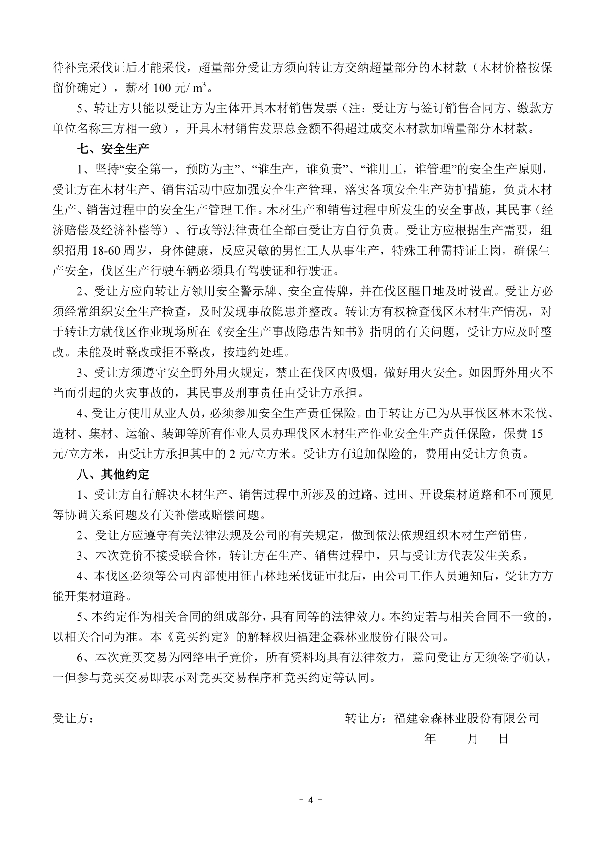 成交確認(rèn)、價(jià)款支付及合同簽訂 | 1 .成交后的兩個(gè)工作日內(nèi)受讓方以微信、郵箱等方式收到《成交通知書(shū)》掃描件或電話通知;若受讓方未及時(shí)收到成交通知書(shū)的,請(qǐng)主動(dòng)與轉(zhuǎn)讓方聯(lián)系。 2.價(jià)款交納日期及方式:成交后,受讓方須于2022年5月3日17:00前將首期木材款(詳見(jiàn)木材資源情況一覽表)及每標(biāo)生產(chǎn)風(fēng)險(xiǎn)保證金6.5萬(wàn)元(含木材生產(chǎn)進(jìn)度、質(zhì)量保證金3萬(wàn)元;銷售進(jìn)度保證金1.5萬(wàn)元;安全生產(chǎn)保證金2萬(wàn)元)轉(zhuǎn)入轉(zhuǎn)讓方指定銀行賬戶,并與轉(zhuǎn)讓方簽訂《木材生產(chǎn)承攬合同》和《木材購(gòu)銷合同》。尾款交付方式以木材資源情況一覽表為準(zhǔn)。 轉(zhuǎn)讓方指定銀行賬戶如下: 戶名:福建金森林業(yè)股份有限公司 開(kāi)戶銀行:福建將樂(lè)成功村鎮(zhèn)銀行股份有限公司 賬號(hào):9031510010010000033058 3.受讓方不依據(jù)本公告的要求履約的,視為自動(dòng)放棄受讓資格,其已交納的交易保證金不予退回,并對(duì)交易中心因此造成的損失承擔(dān)賠償責(zé)任,轉(zhuǎn)讓方有權(quán)將該標(biāo)的重新組織競(jìng)買交易。 | ||